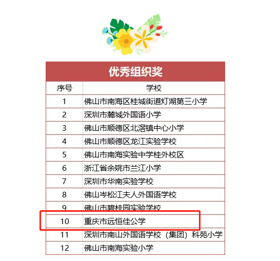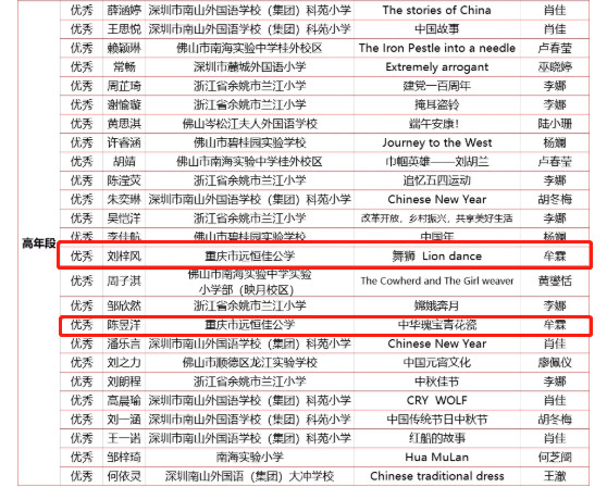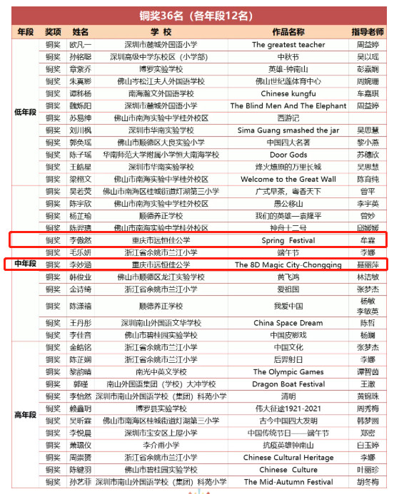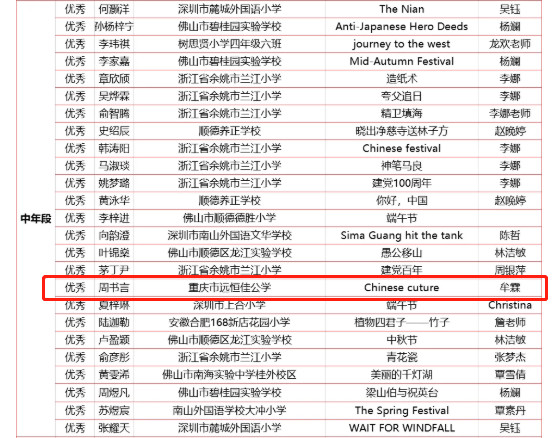 為弘揚中華優(yōu)秀文化,提高廣大學生英語學習趣味。2021年暑假,重慶市遠恒佳學校小學部英語組組織學生參加了新啟翔圖書聯(lián)合粵港文化教育交流發(fā)展中心、A100教學聯(lián)合舉辦“用英語講中國故事”第一屆全國小學生英語手抄報風采展示活動。本次我校共有28名同學參加比賽,其中,李傲然同學、李妙涵同學榮獲中年段銅獎;周書言同學榮獲中年段優(yōu)秀獎;劉梓風同學、陳昱洋同學榮獲高年段優(yōu)秀獎。聶麗萍老師、牟霖老師榮獲優(yōu)秀指導教師獎;重慶市遠恒佳學校榮獲優(yōu)秀組織獎。
