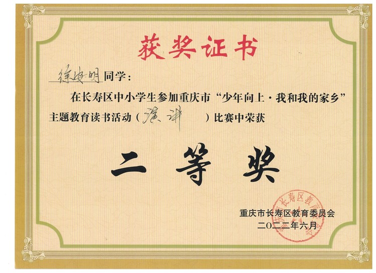 • 少年至上——重慶市“少年向上·我和我的家鄉(xiāng)”主題讀書活動征文比賽(中學(xué)組)二等獎
