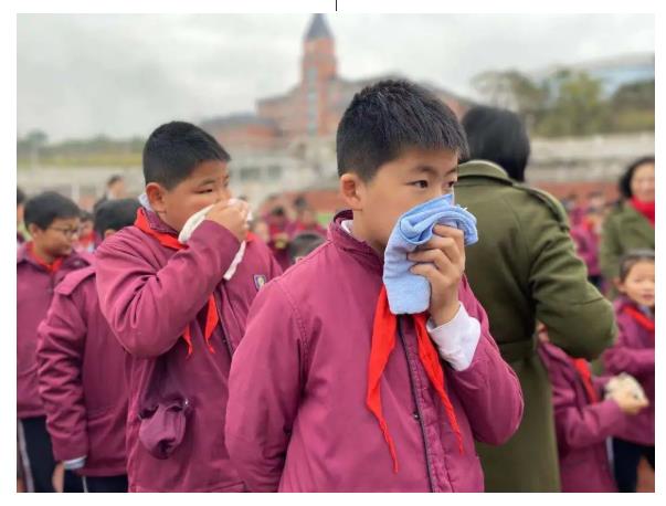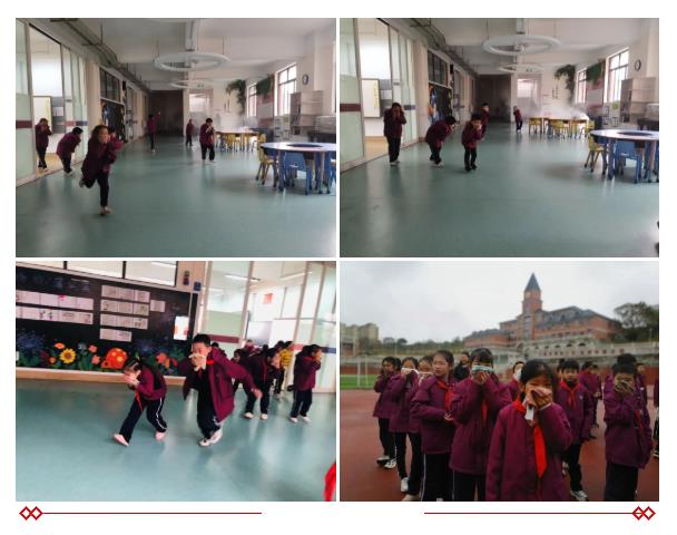 演練開始,只見小學部、中學部學生紛紛用毛巾捂著口鼻,半躬著身體依次從教學樓撤出,國際部學生用書包等物品頂在頭上依次撤出教學樓。整個撤離過程井然有序,沒有發(fā)生學生因慌亂而引起的摔倒、踩踏事故。
