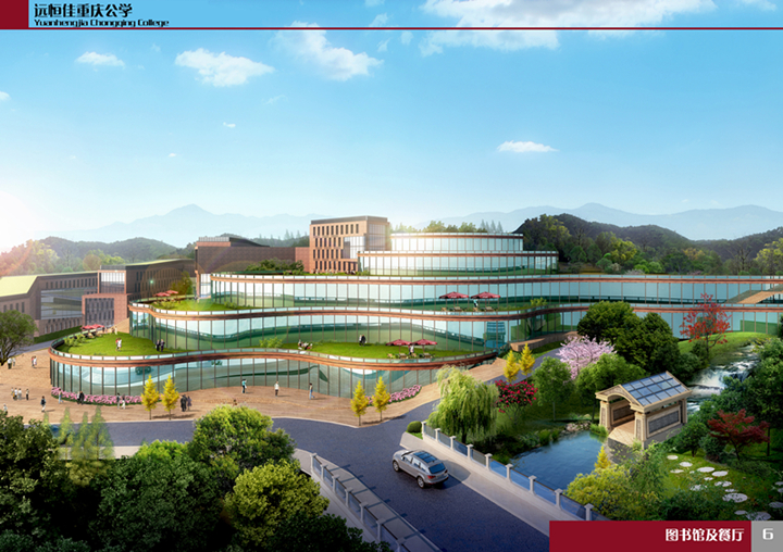 9000平方米的餐廳圖書館,為師生提供生活飲食和精神食糧,面朝湖水,背依山頂公園,依山勢而建,寓意“學海無涯、書山有路”。前三層為餐廳和自由閱讀空間,小包間與社團小組分享室合二為一;后兩層為開放圖書館,學生可在廳前草坪、溪畔和山頂公園以書為友,神馳古今。師生飲水思源,心暖花開;對話自然,問道經(jīng)典。