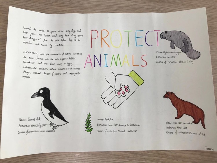 項(xiàng)目式教學(xué)是在教師指導(dǎo)下,以學(xué)生為中心,通過(guò)完成一個(gè)完整的實(shí)踐性項(xiàng)目而進(jìn)行的教學(xué)活動(dòng)。它要求學(xué)生運(yùn)用已有知識(shí)和經(jīng)驗(yàn),通過(guò)親手操作,在具體情境中解決實(shí)際問(wèn)題,進(jìn)而促進(jìn)綜合能力的發(fā)展。項(xiàng)目可以是設(shè)計(jì)與制作一件產(chǎn)品、排除一個(gè)障礙、提供一項(xiàng)服務(wù)、解決一個(gè)問(wèn)題或宣傳一個(gè)理念等。遠(yuǎn)恒佳留學(xué)部學(xué)生,利用海報(bào)概括一個(gè)歷史時(shí)代;生物課宣傳保護(hù)環(huán)境或動(dòng)物的想法;經(jīng)濟(jì)科可以宣傳一帶一路等國(guó)家政策。同學(xué)們通過(guò)畫筆表達(dá)自己對(duì)所學(xué)知識(shí)的理解。