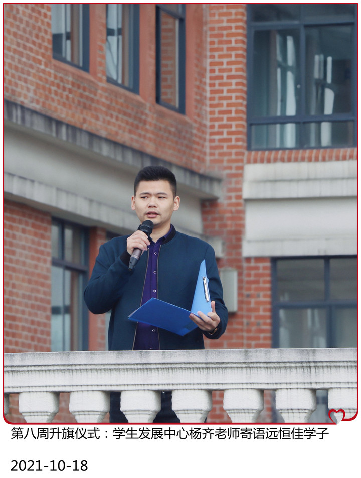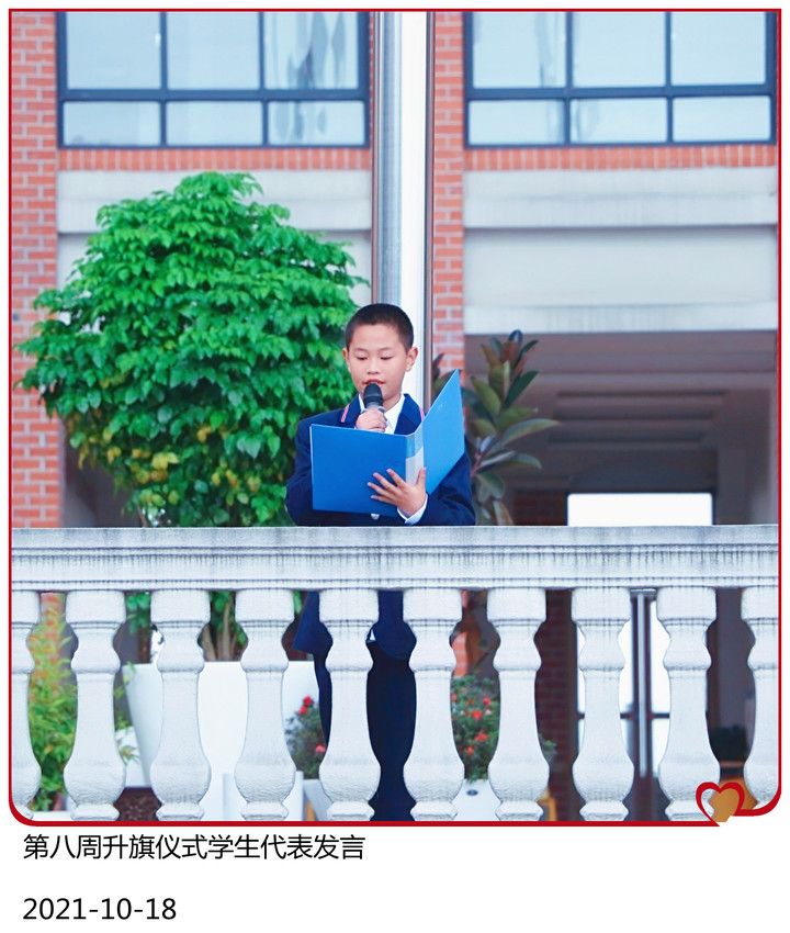 在第8周升旗儀式上,學(xué)生代表何向陽同學(xué)在國旗下發(fā)表了題為《珍惜時(shí)間、勤奮學(xué)習(xí)》的講話。