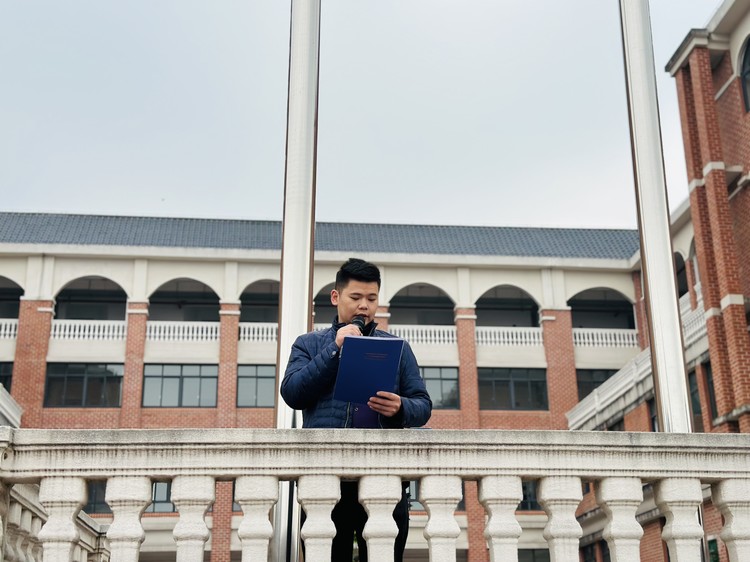 圖為學(xué)生發(fā)展中心副主任楊齊老師發(fā)表國旗下的講話