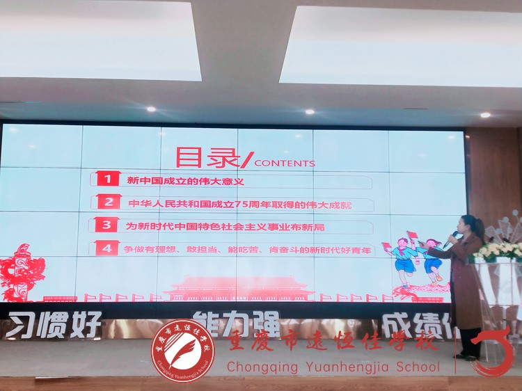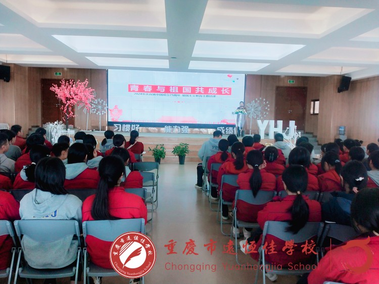 悠悠歲月,見(jiàn)證偉大歷程;歷史長(zhǎng)河,奏響壯麗樂(lè)章。為慶祝中華人民共和國(guó)成立75周年,致敬偉大祖國(guó),弘揚(yáng)愛(ài)國(guó)主義精神,夯實(shí)青年信仰之基、擔(dān)當(dāng)之責(zé)、奮進(jìn)之力。重慶市遠(yuǎn)恒佳學(xué)校于2024年11月7日在龍行廳開(kāi)展“青春與祖國(guó)共成長(zhǎng)”主題團(tuán)課學(xué)習(xí),學(xué)校辦公室主任、高中部德育主任、團(tuán)委書記龔朝蓮主講,各班團(tuán)員和入團(tuán)積極分子百余人參會(huì)。
