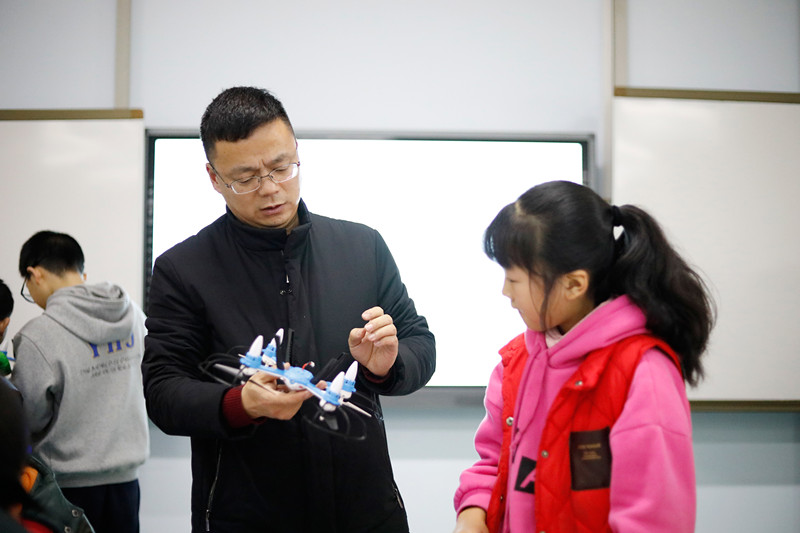 學(xué)校首席教師劉賢俊老師帶著十多名小助教進(jìn)行現(xiàn)場教學(xué),45位同學(xué)在航空航天工作室內(nèi)了解無人機(jī)的基本結(jié)構(gòu)、制作方法與遙控操縱的基礎(chǔ)知識(shí)后,每位同學(xué)都動(dòng)手組裝了一架無人機(jī)。遠(yuǎn)恒佳航模隊(duì)的同學(xué)們分小組帶領(lǐng)著來校的小伙伴們進(jìn)行試飛體驗(yàn),手把手教會(huì)了遙控飛行的基本操作技能,讓小伙伴們嘗到了成功飛行的喜悅。