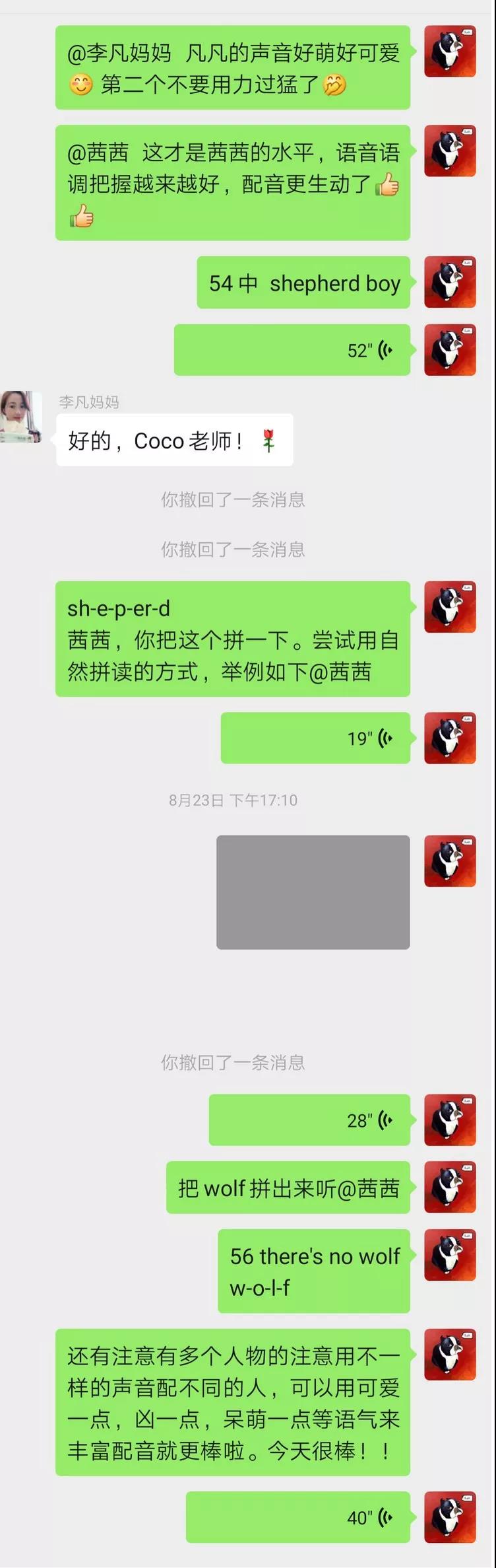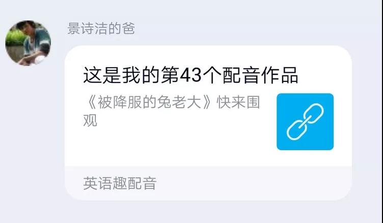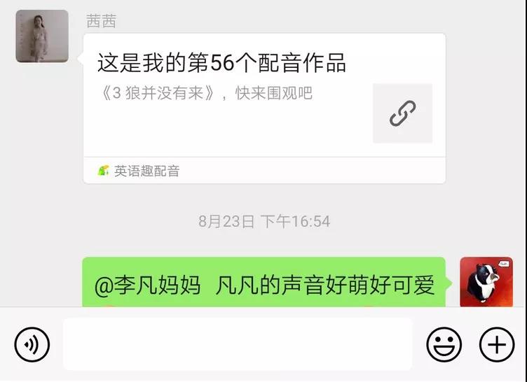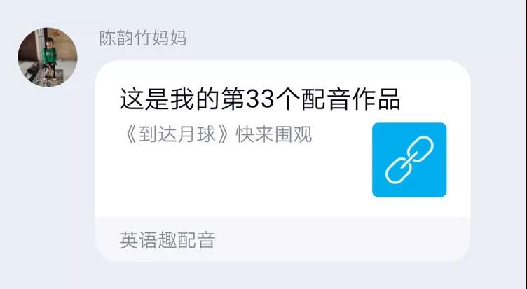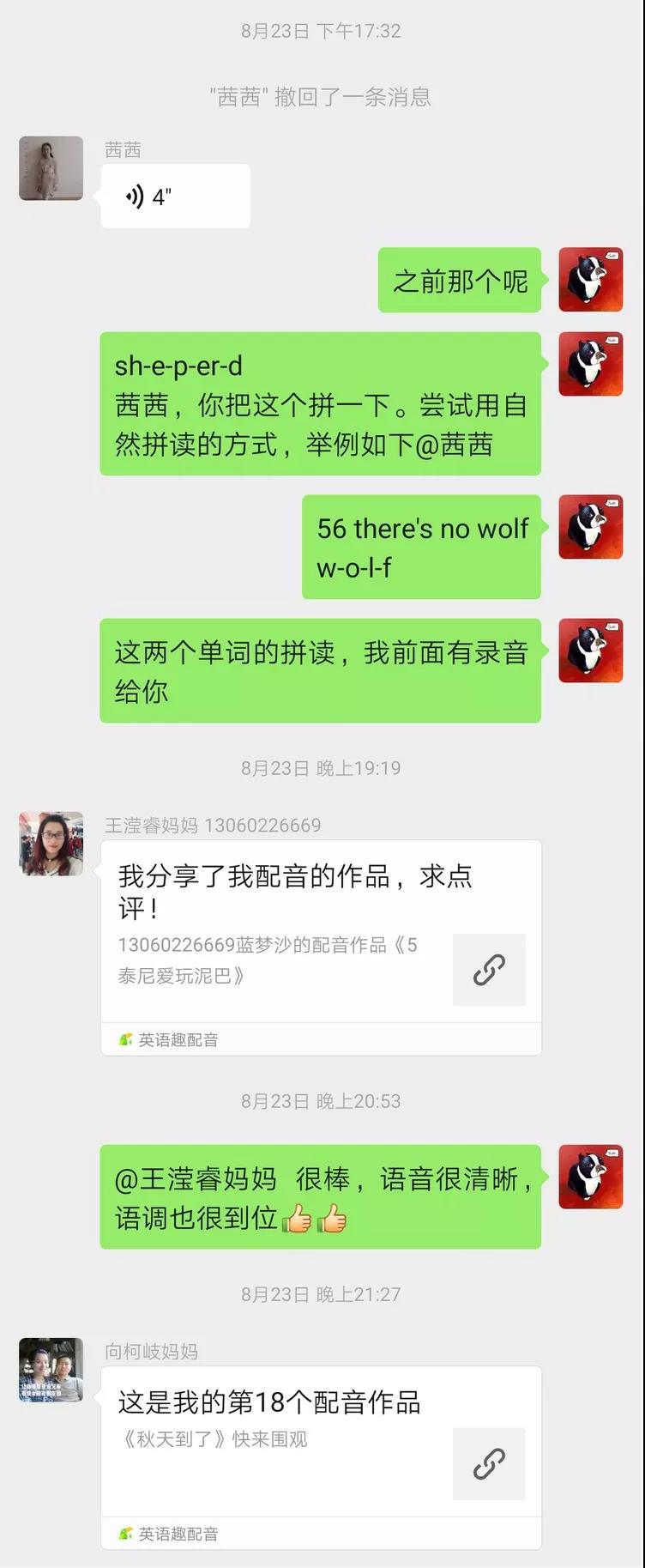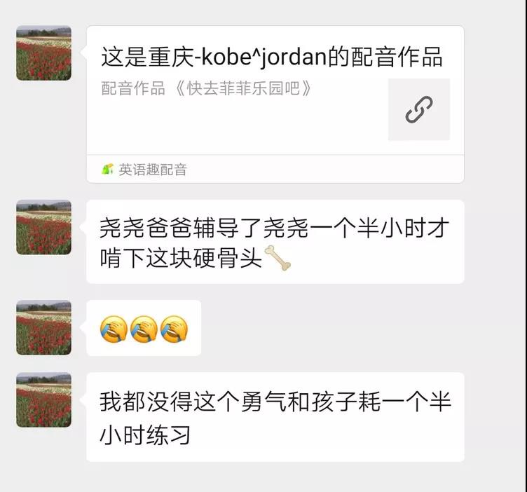 最讓人嘆為觀止的是二年級(jí)的邢梓堯同學(xué),一段30多秒的配音,竟然和他爸爸一起練習(xí)了一個(gè)多小時(shí),還有的家長(zhǎng)為了給孩子營(yíng)造良好的氛圍,主動(dòng)與孩子分角色共同配音。我們的老師,有多少段配音,就有多少回復(fù)。哪個(gè)音沒讀準(zhǔn),哪句語(yǔ)調(diào)沒對(duì),我們的老師們都不厭其煩地為其糾正,指導(dǎo)。