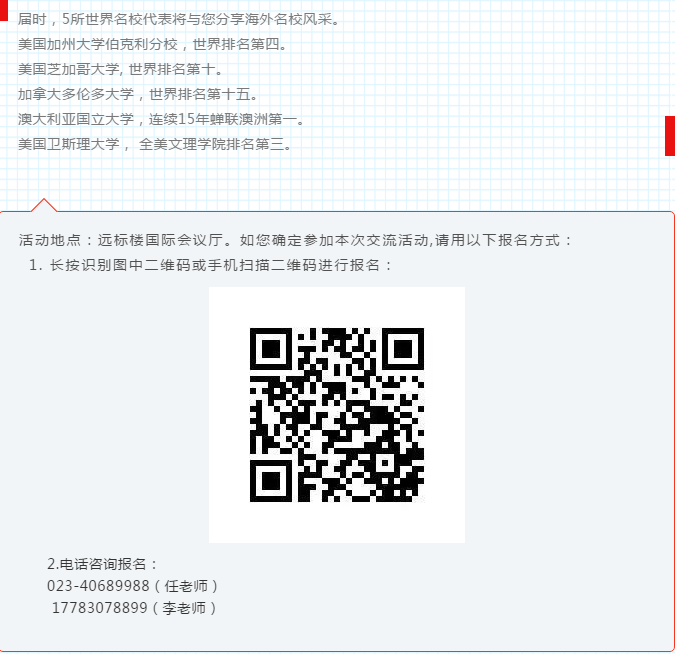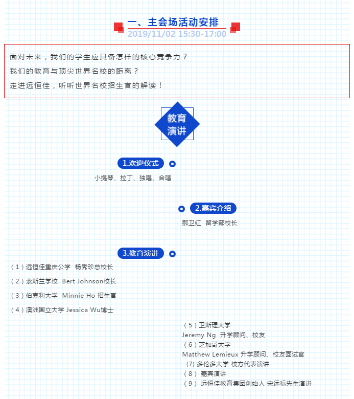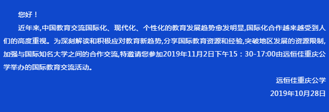 近年來,中國教育交流國際化、現(xiàn)代化、個(gè)性化的教育發(fā)展趨勢(shì)愈發(fā)明顯,國際化合作越來越受到人們的高度重視。為深刻解讀和積極應(yīng)對(duì)教育新趨勢(shì),分享國際教育資源和經(jīng)驗(yàn),突破地區(qū)發(fā)展的資源限制,加強(qiáng)與國際知名大學(xué)之間的合作交流,特邀請(qǐng)您參加2019年11月2日下午15:30-17:00由遠(yuǎn)恒佳重慶公學(xué)舉辦的國際教育交流活動(dòng)。